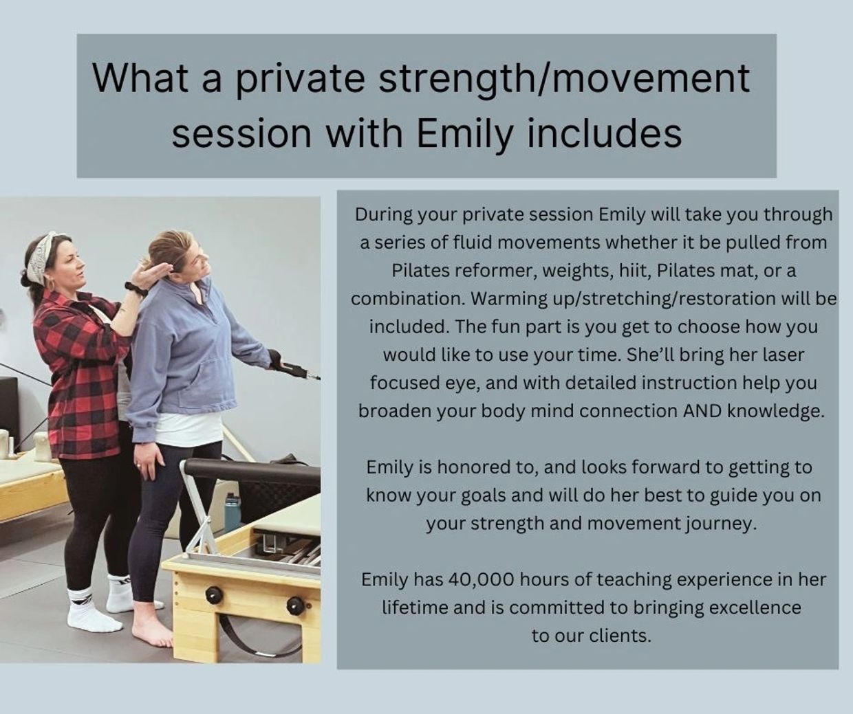 Private Pilates instructor is available for 1:1 ratio with extensive specialization and individualized training for high level benefits and attention.